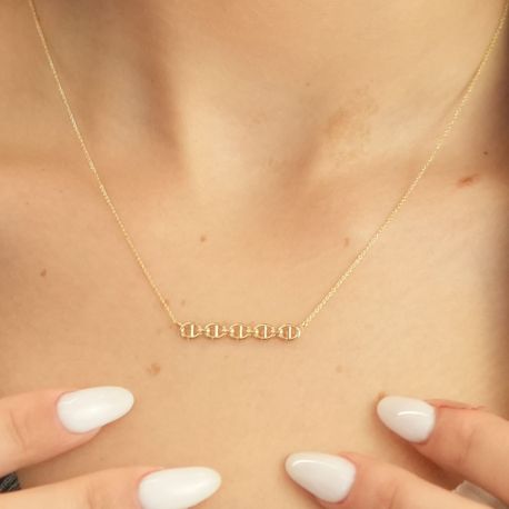 Gold chain in an anchor link design The chain includes a central horizontal element consisting of 5 links in an anchor structure (oval link with a crossbar in its center ) .