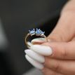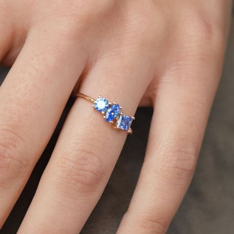 The ring features 3 zircons in blue color and in square marquise and round shapes located at the center of the ring .